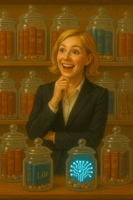 Het plaatje hieronder verbeeld Colette in de snoepwinkel van juridische vraagstukken die GenAI met zich meebrengt op allerlei gebieden, zoals privacy, IE en consumentenbescherming.